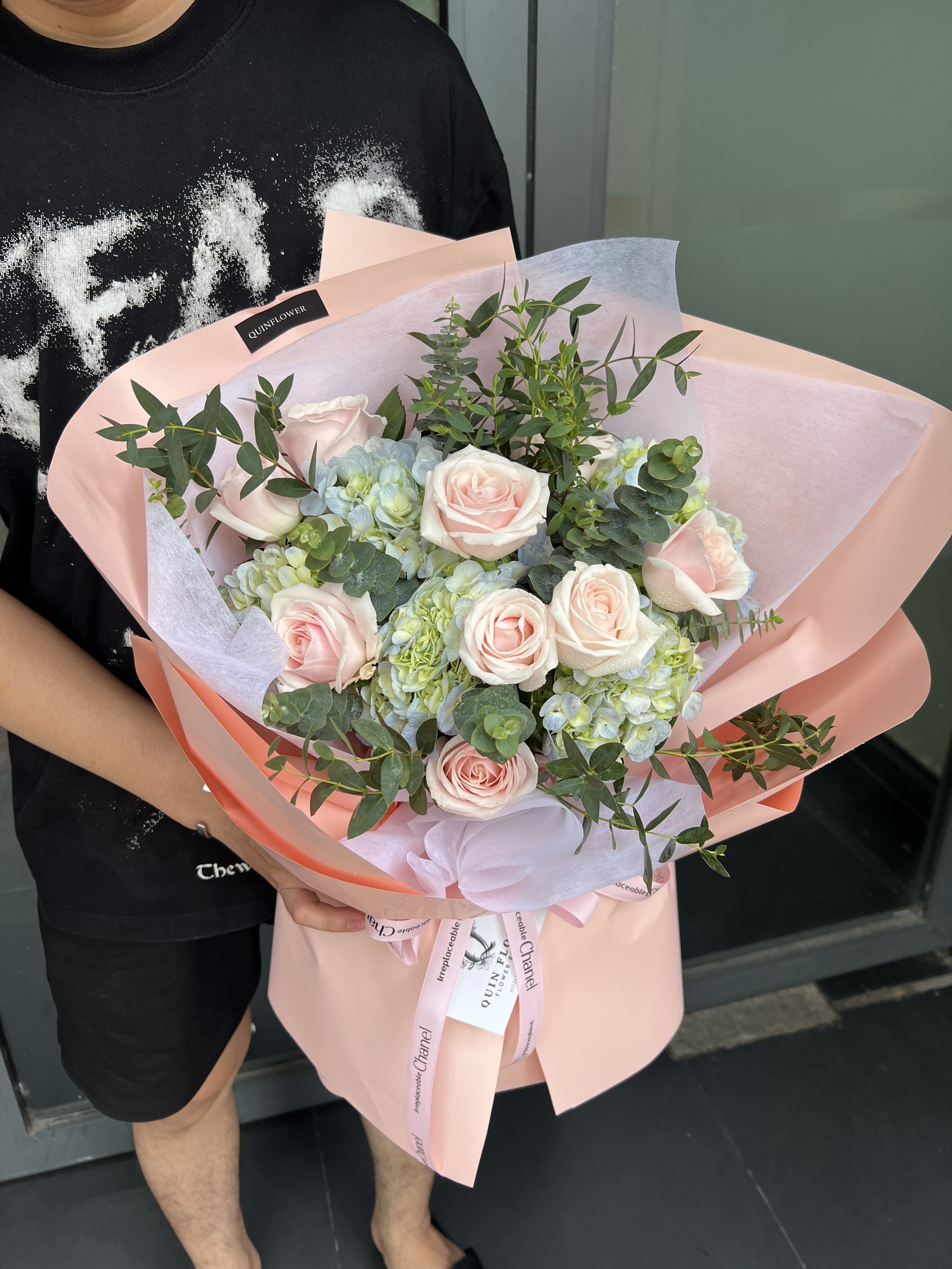 Bó Hoa Hương Kem Dịu Dàng – Hoa Hồng & Cẩm Tú Cầu Pastel Sang Trọng | Qflower TP.HCM